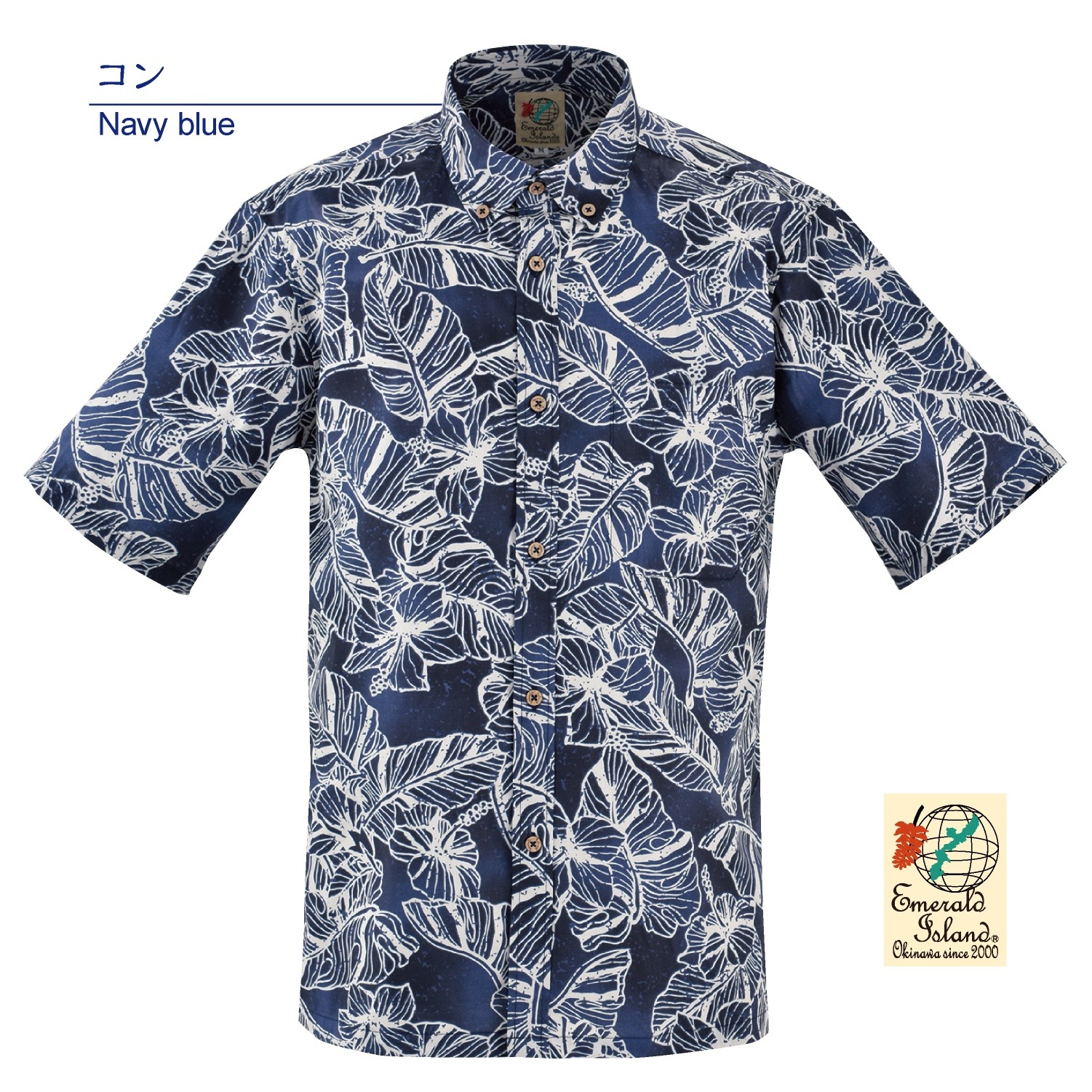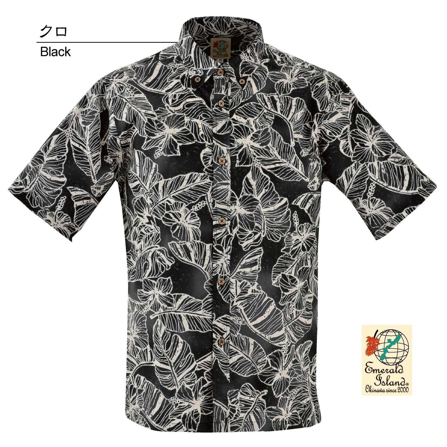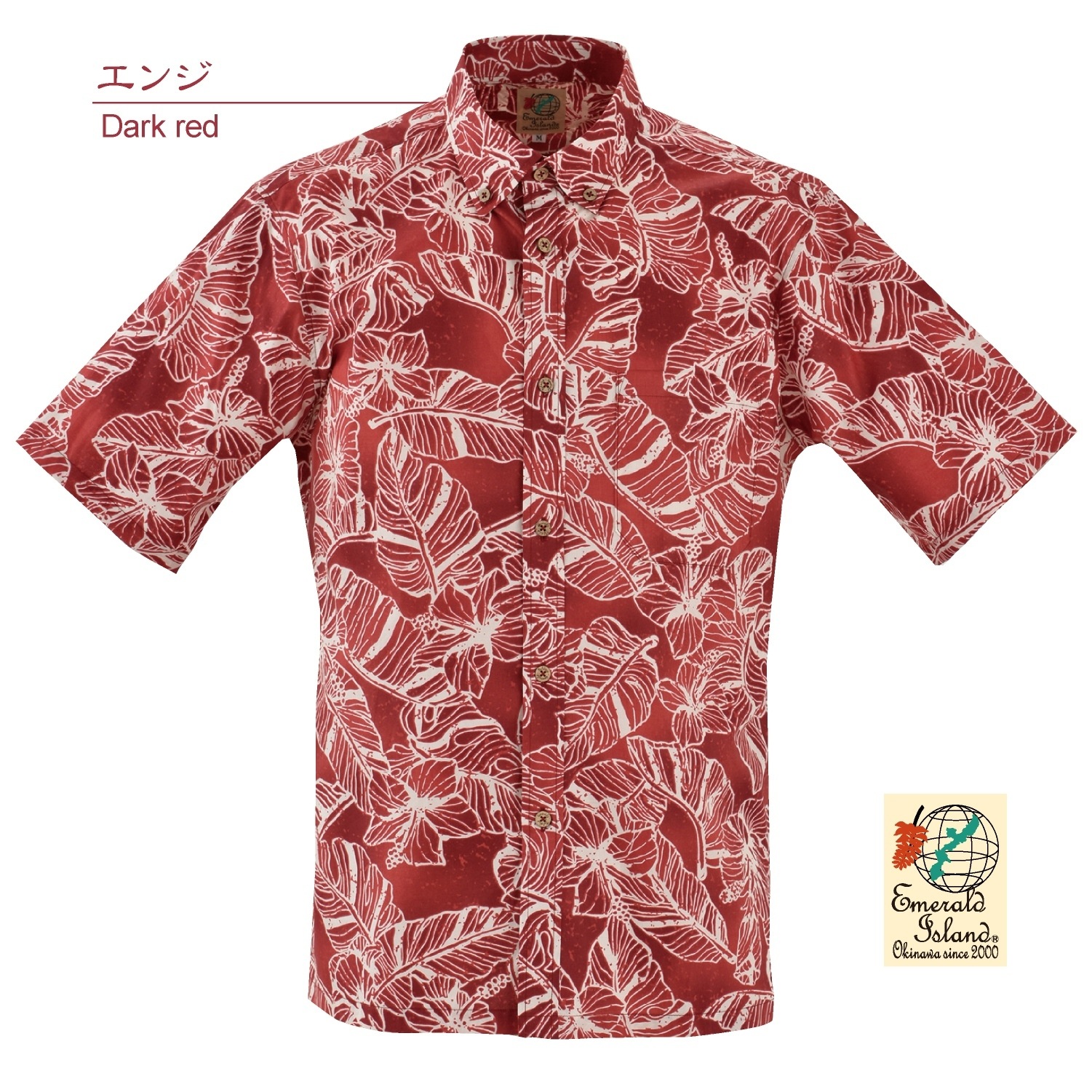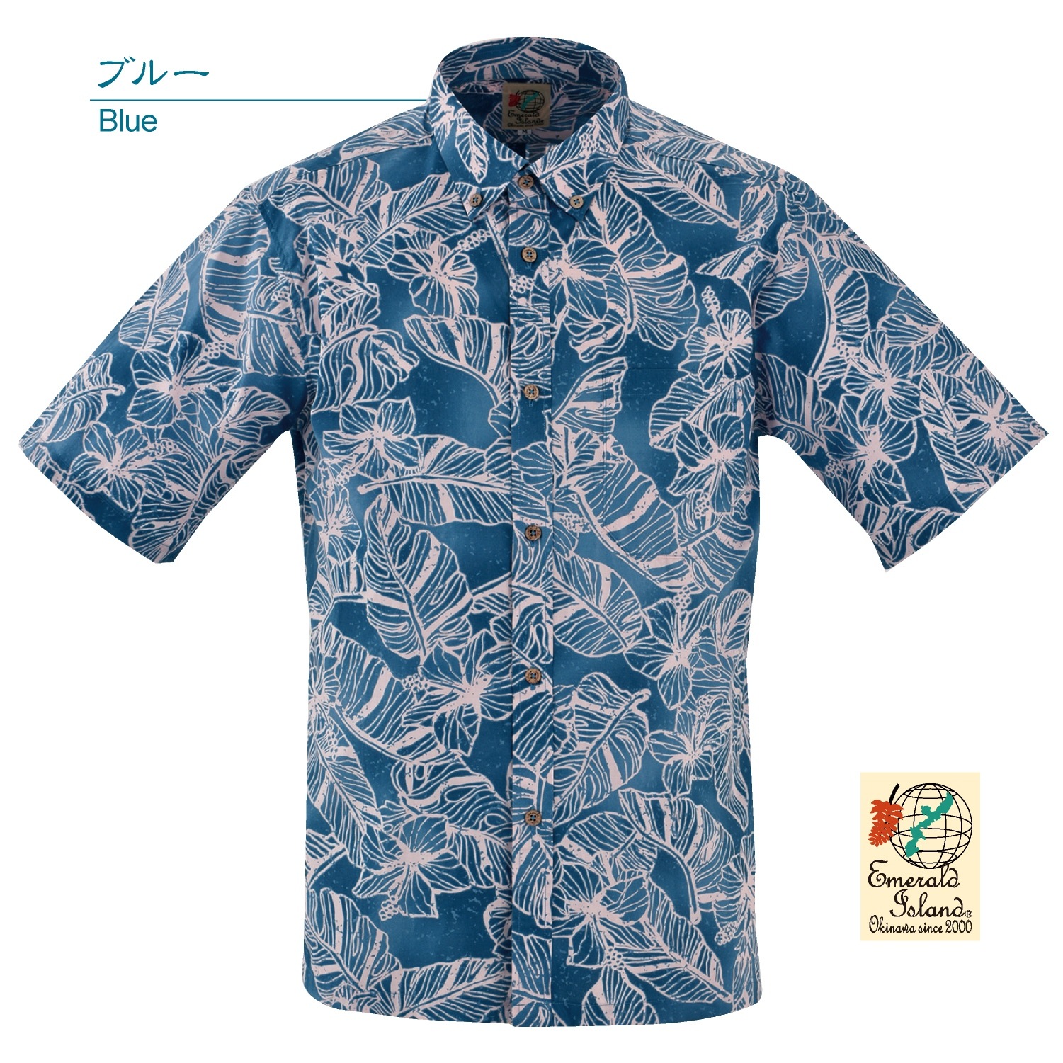 EM1889B メンズ <ハイビモンステラ柄> ボタンダウン 半袖