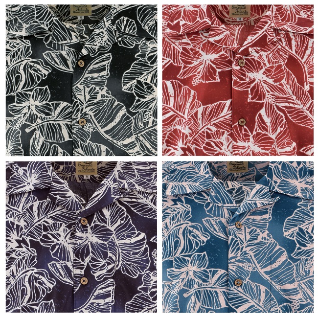 濃淡のあるベースカラーに、ハイビスカスの花やモンステラの葉を毛筆で描いたような柄。爽やかなデザインの開襟シャツです。